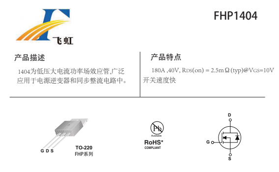 FHP1404的主要封裝形式是TO-220,腳位排列位GDS。這款1404場效應管產品具體參數:Vgs(±V):25;VTH(V):2.5-4;ID(A):180;BVdss(V):40。RDS (on) = 2.5mΩ(typ)@V GS =10V,180A大電流40V電源MOS管開關速度快。