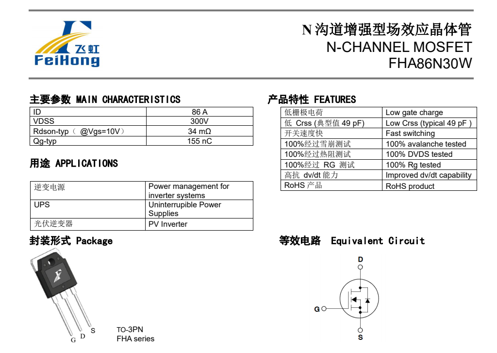 為何?因為FHA86N30W具備低導通內阻、高抗dv/dt能力、100% EAS測試、抗沖擊能力強、100% DVDS熱阻測試、散熱性能好、100% Rg測試、測試標準高(100%各項參數測試+VTH分檔,參數一致性好)、可靠性高的特點,是一款能夠滿足工業級的場效應管型號。