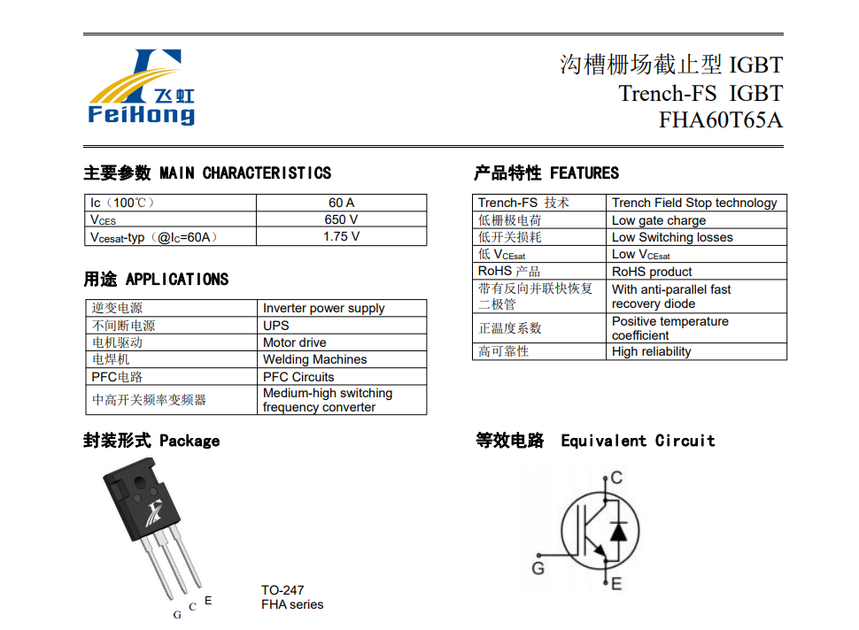 目前飛虹半導體的FHA60T65A型號IGBT產品參數特點為: